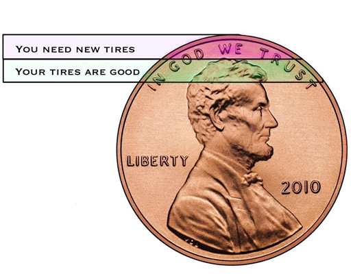 If part of Lincoln’s head is always covered by the tread, you have more than 2/32″ of tread depth remaining.